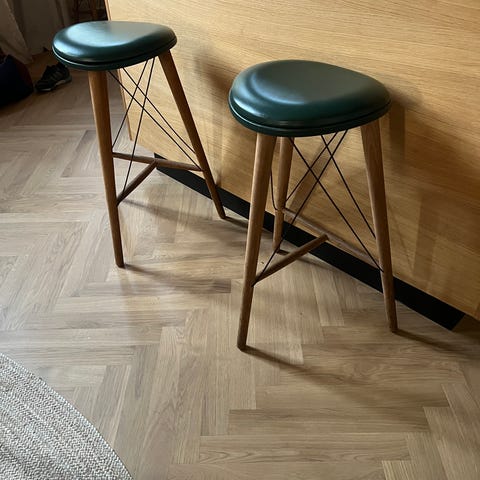 Højde 74 cm. B 36,5 x D 36,5 cm. Rundt lædersæder i cognac med ben i røget eg, lædersnore er sorte. En virkelig flot kombination er her valgt. De 2 barstole er som helt nye, står blot til pynt og bliver ikke brugt. Nypris står til pr. stk. kr. 3.895,- Sælges for kun kr. 1.800, - pr. stk. Skal sælges som et par. Her får du 2 nye barstole til under prisen på 1 ny stol. De er meget flotte og skal ses :-)