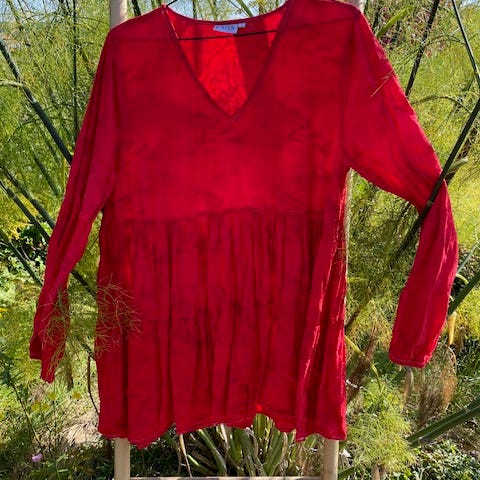 Tunika. Lyseblå/sølvstribet str S mrk. FRN. Brystmål ca 86 cm. Fuld længde 79 cm. Slids i siderne 20 cm. Bomuld. Tyndt stof. Fra røgfrit hjem. Kan sendes med gls. Køber betaler porto. (Cam)(Cec ks har.n)(25)