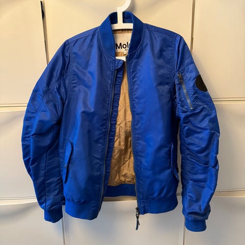 Molo Bomber- / sommerjakke i størrelse 140 der er som ny. Jakken har broderede fugledetaljer på fronten og ribkanter ved ærmer og talje samt lynlåslukning foran.