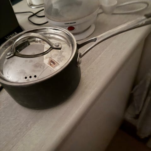 Lille kasserolle 8 cm høj og 16 cm i diameter med sort skaft. Med låg med sort håndtag som kan justeres (åbnes / lukkes) . IKKE TIL INDUKTION.