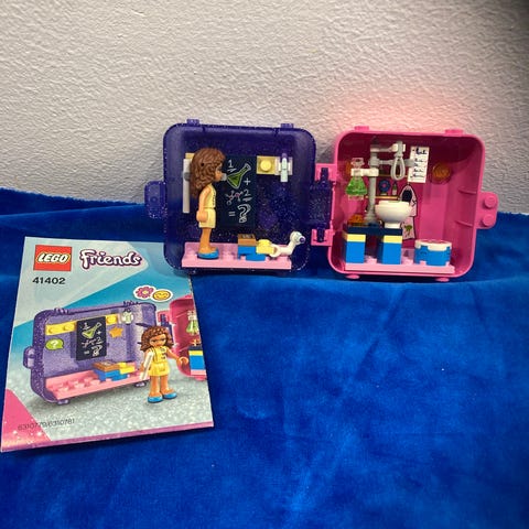 LEGO Friends mini legetøjssæt bestående af to små opbevaringskasser i blå og grøn, med tilbehør som møbler, en dukke med rødt hår og en lille gul hundefigur. Sættet inkluderer detaljerede elementer som en kaffemaskine, en tavle og diverse små dekorationer. Materiale: plastik. Velegnet til børn.