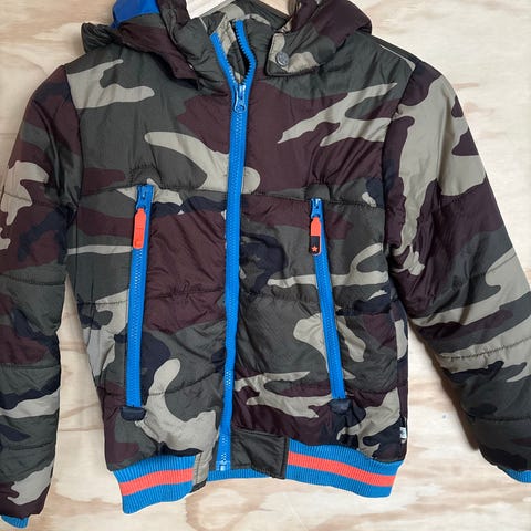 Varm og lækker vinterjakke fra molo i multifarvet militær. Den er str 128 men meget stor i størrelsen. Meget begrænset brugt - syner som ny.