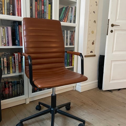 Sid behageligt og afslappet i denne kontorstol med sort læderindtræk og en luksuriøs ramme af træ. Denne stol er lavet af kvalitetsmaterialer og dens ekstra tykke siddehynde med de to armlæn gør du sidder godt ligemeet om det er derhjemme eller på kontoret. Stolen er udstyret med et polstret hovedstøtte for du får den bedst mulige komfort når du sidder i denne kontorstolen. Konstorstolen kan tilpasses efter din kropsvægt og højde da den nemt kan justeres efter behov.