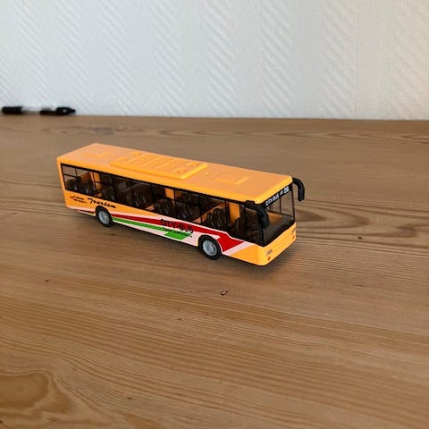 Praline bus malet som DSB bus med den karakteristiske grå stribe. Pakker på tagbagagen.