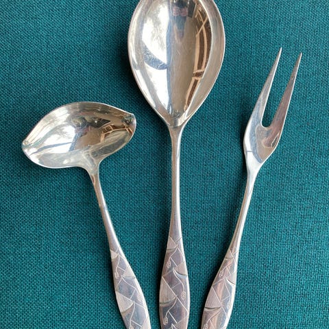 Diverse tilbehør: kartoffelske, stegegafler (2stk), kagespader (2stk), div serveringsskeer, etc (se billede) pris pr stk 75 kr. Lagkagekniv og sovseske er solgt.