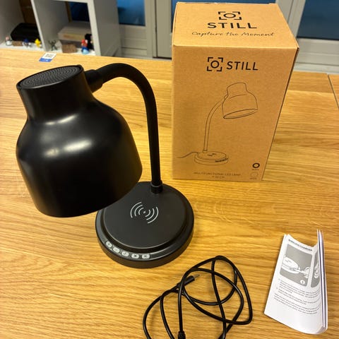 Stilfuld Still LED-lampe med trådløs oplader og indbygget Bluetooth-højttaler.