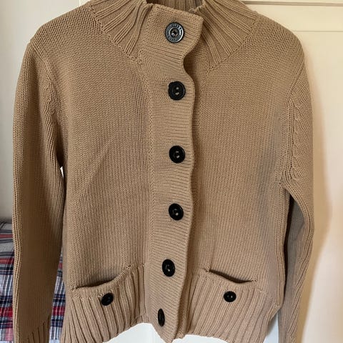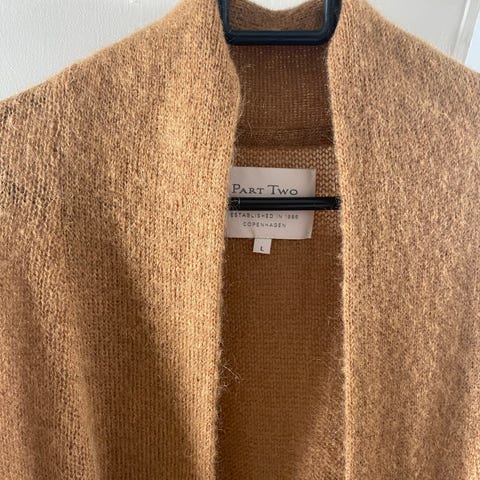 Cardigan fra Part Two i farven sort/grå/brun nistret og med lynlåslukning. Trøjen er i størrelse L med et brystmål på cirka 100 cm og en længde på cirka 56 cm. Cardiganen er fremstillet af 56% bomuld og 44% akryl. Blusen medfølger ikke. Cardiganen er helt ny og ubrugt.