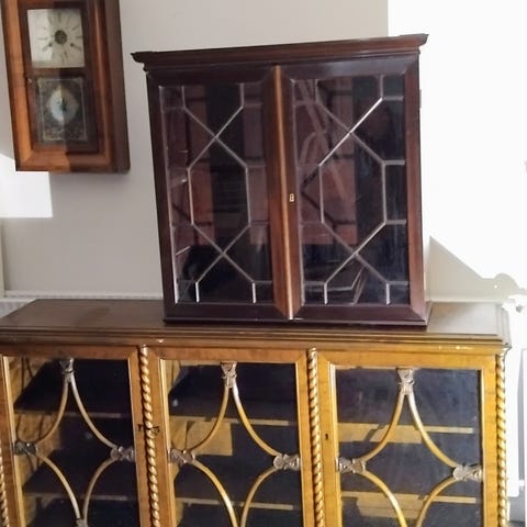 2 vitrineskabe højde 192 cm bredde 80 dybde 35. Høj kommode 135 cm bredde 41 dybde 45. Lavere kommode højde 100 cm bredde 35 dybde 35