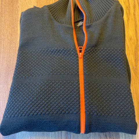 Pasformen er fantastisk og materialet er varmt og lækkert. Modellen er den meget velkendte “Wool Klemens Zip Kontrast” med orange lynlås og orange syning nederst på ærmerne.