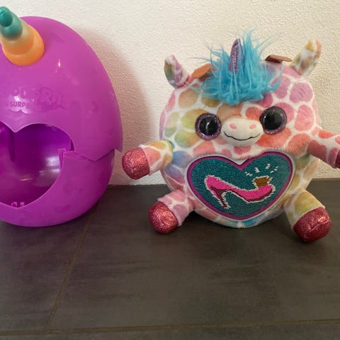 Enhjørninge-løvebamse i stort æg med horn. Der medfølger en lille figur, armbånd og spænde med vende pailletter.