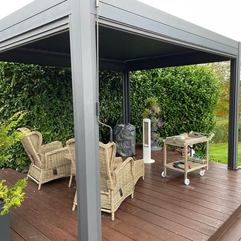 Flot og stilren pavillon af mærket utsikt fra Enggården i kraftig antracit farvet aluminium, hvor taget kan åbnes. Pavillonen måler 3 x 4 m og er 2,5m høj inkl. 2 sidegardiner.