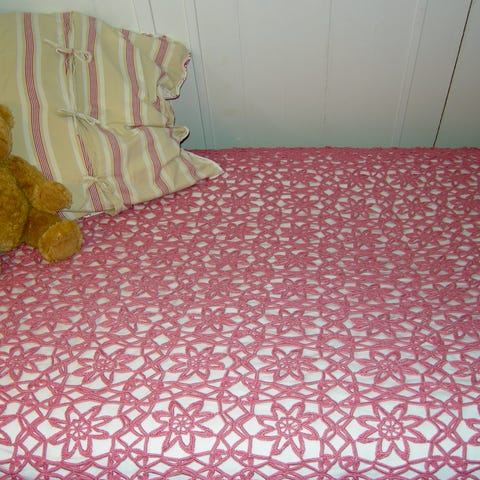 Flot nyhæklet ferskenfarvet sengetæppe.