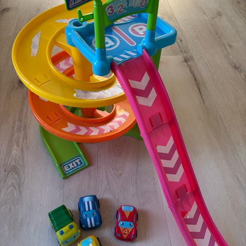 Bilbane, lavet som puslespilsbrikker af noget “filt gulvtæppe”. Der er 31 stk. De er godt brugt, men kan sagtes klare mange lege endnu 😊