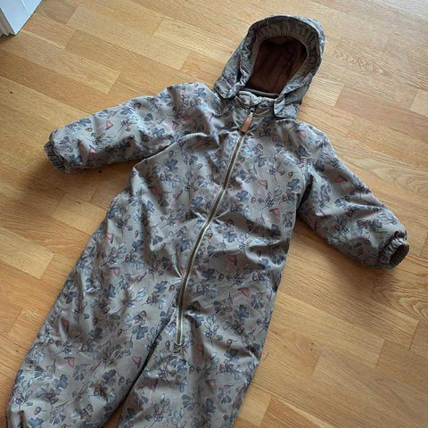 Lil'Atelier flyverdragt i størrelse 128 til piger. Farven er brun med et mønster. Flyverdragten har lynlås foran og elastiske manchetter ved ærmer og ben for bedre pasform. Materialet er ikke specificeret, men dragten er designet til børns udendørs brug.