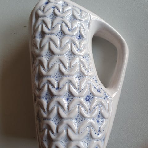 Keramik kande dekoreret med et zigzag mønster. Vasen har en smal hals med en lille tud, hvilket gør den velegnet til enkelte blomster eller som dekorativ genstand. Farven er hovedsageligt hvid med brune detaljer i mønsteret. Materialet er keramik, og designet er enkelt og funktionelt.