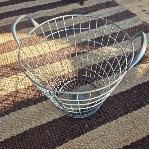 Fin metalkurv til gran, æbler, nødder etc. Højde til hank 30 cm, længde 40 cm, bredde 26 cm.