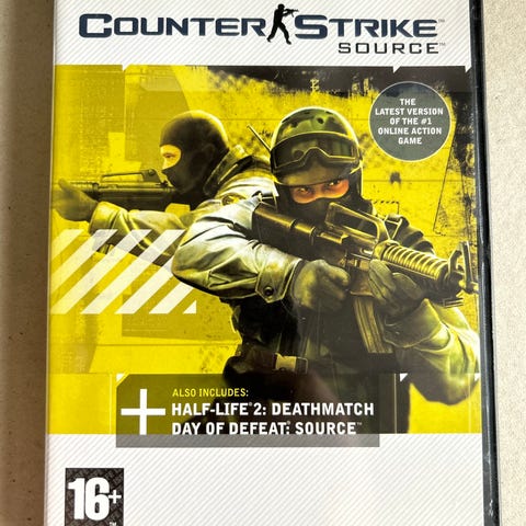 Valve Counter-Strike Source PC-spil. Inkluderer Half-Life 2 Deathmatch og Day of Defeat Source. Online multiplayer actionspil med taktisk gameplay. Anbefalet aldersgrænse 16+.