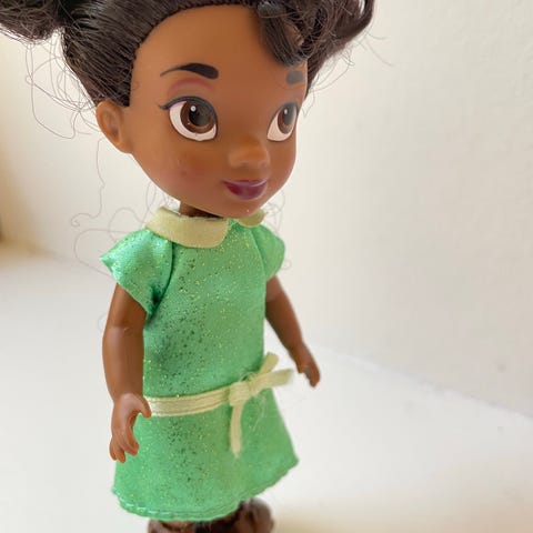 Disney dukke med blå kjole og lilla detaljer. Dukken har langt blondt hår med en blå kjole