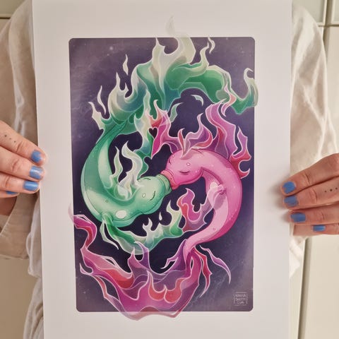 Unikt kunstprint skabt af mig som illustrator. Motivet forestiller et fantasifuldt creature, inspireret af en whippet / hund / vandmand / brændmand.