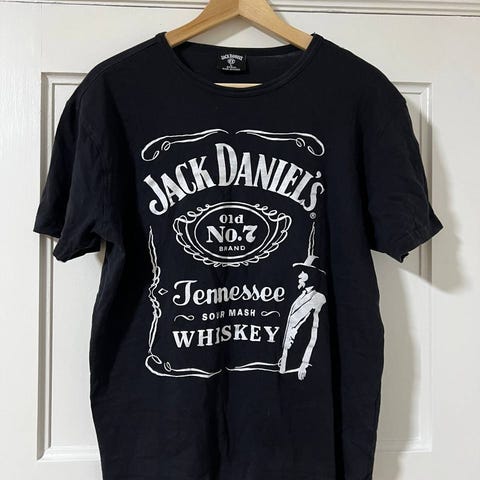 T-shirt med et tryk af en tegnet figur med en flaske Jack Daniel's og en skattekiste.