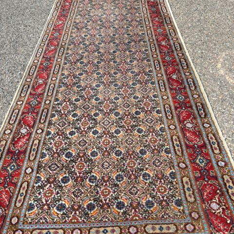 Ægte orientalsk Moud løber til (lang) gang/entre. Måler 586 x 80 cm. Købt på Mernilds auktion for ca 20 år siden, men har ligget på lager seneste knapt 15 år efter flytning til mindre bolig.