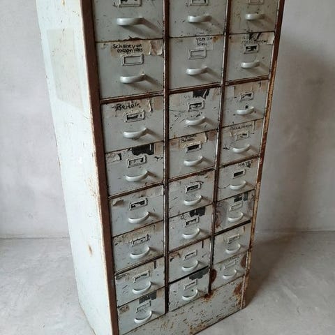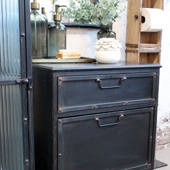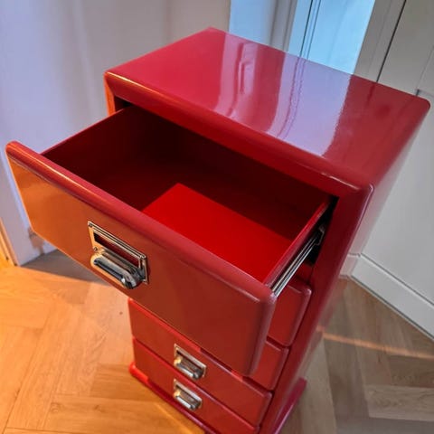 Med sine flere rummelige skuffer og robuste konstruktion kombinerer møblet æstetik og funktion – perfekt til både kontor, entré, værksted eller som statement piece i en moderne boligindretning.