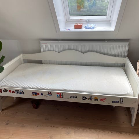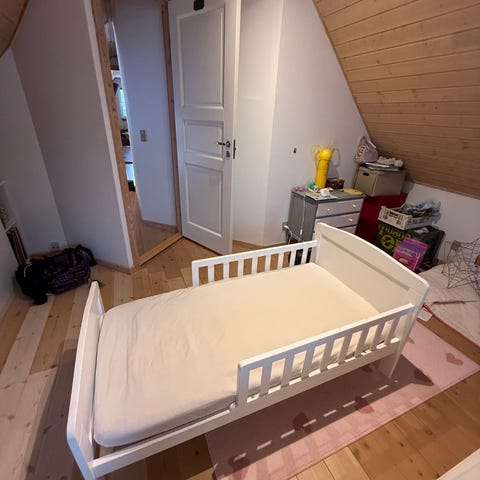 Juniorseng i hvidt træ. Sengen har tremmesider og en robust konstruktion. Uden madras. Madrasstørrelse 130x70cm. Kan justeres i 3 højder