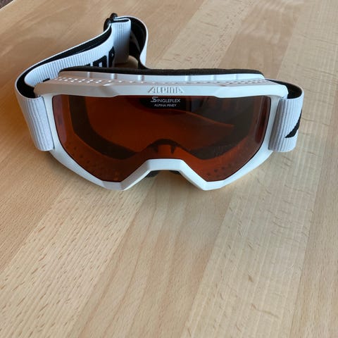 Alpina skibriller med hvid ramme og orange spejlglas. Brillen har en justerbar elastisk rem med Alpina-logo. Indvendigt er der blødt skum for komfort og beskyttelse mod sne og vind. Designet til at passe til vintersport og beskytte øjnene mod UV-stråler og refleksioner.