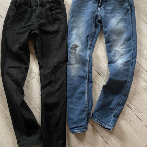 Et par sorte jeans med diamanter på siden. Nogle af diamanterne er faldet af men man ser det ikke rigtigt. De er størelse 152.