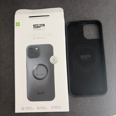 SP Connect Phone Case til iPhone 14 Pro Max i sort farve. Fremstillet til at give sikker og hurtig montering af mobilen. Designet med mulighed for at fastgøre og låse mobilen sikkert, samt kompatibel med forskellige monteringsløsninger. Materiale og yderligere specifikationer ikke angivet.