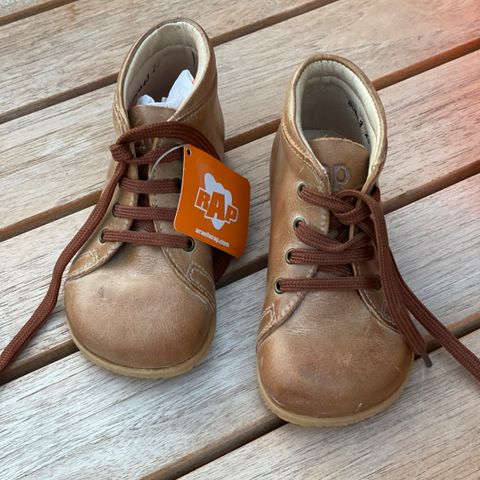 Skoene er i blødt læder og har velcrolukning og fleksibel sål.