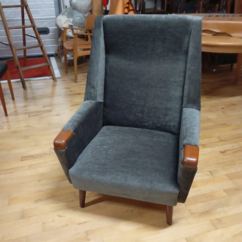 Stolen er i flot stand og ville blive endnu flottere hvis den blev ombetrukket. Der er en lille spræk i det ene armlæn...dette har ikke indflydelse på stabiliteten i stolen.