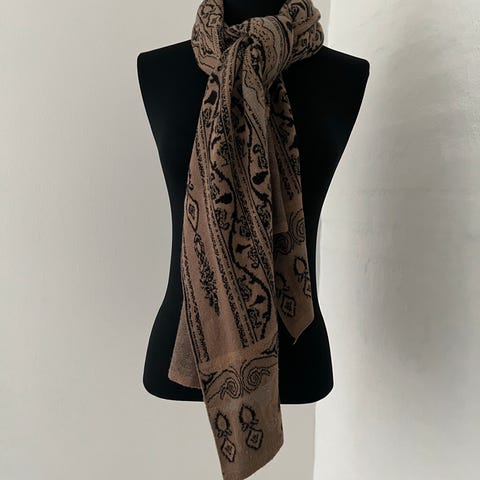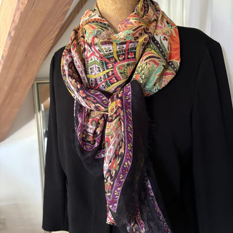 Elegant, smukt og blødt ETRO tørklæde i modal og silke. Parsley mønster på sort baggrund.