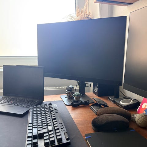 Der medfølger en gasarm som skærmen kan hænges på, som kan sættes fast i bord eller på væggen.