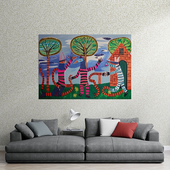 Maleriet emmer af styrke, leg og kamp, hvor masken bliver både skjold, våben og identitet. Det er en duel og en dans på én gang, fuld af humor og kraft.