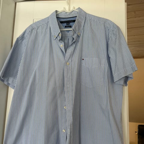 Tommy Hilfiger skjorte i blå farve, størrelse L til herre. Skjorten har lange ærmer og knaplukning foran. Den er fremstillet i let materiale og har et diskret Tommy Hilfiger logo på brystet.