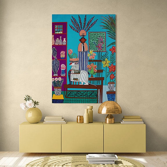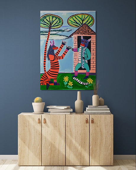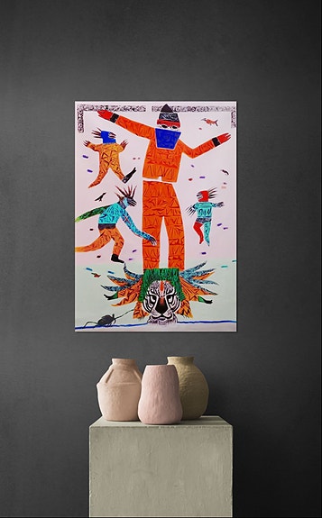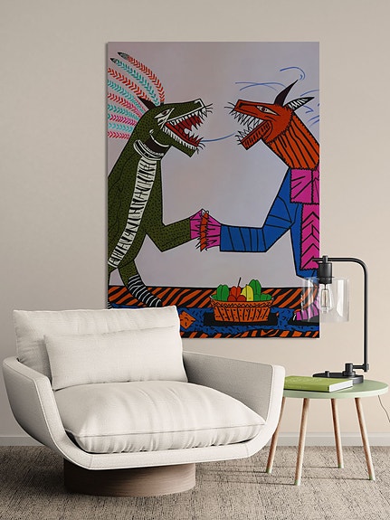 I et gult marklandskab står en mærkelig, lyserød bygning formet som en kvindelig torso. En mand nærmer sig, mens et barn allerede er gået ind i åbningen ved foden. Til venstre skriger en maskeagtig figur, munden åben i desperation. Foran står en skål fyldt med runde skiver, måske brød, måske øjne. Himlen er tung, men horisonten er vid.