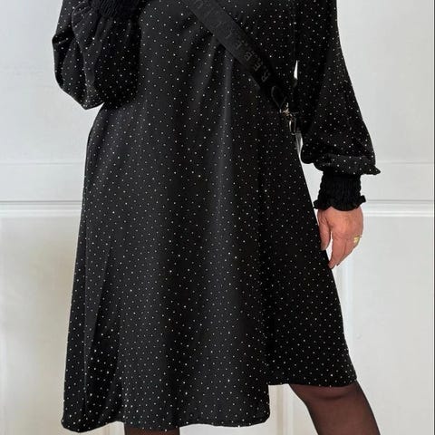 Fantastisk smukt presset sort 100 pct. silkesæt fra Charlotte Østergaard tidl. Nikolaj Plads i str. M. Elastik i talje, blonde på underskørt. Bælte optional. Talje ca. 68 - 82. Kan sendes efter aftale.