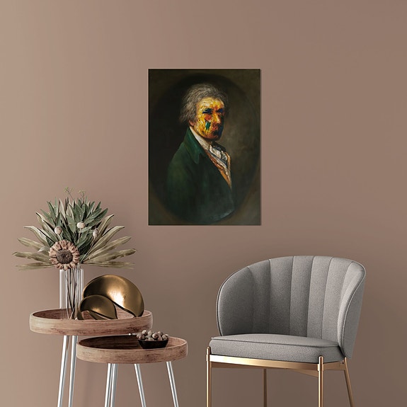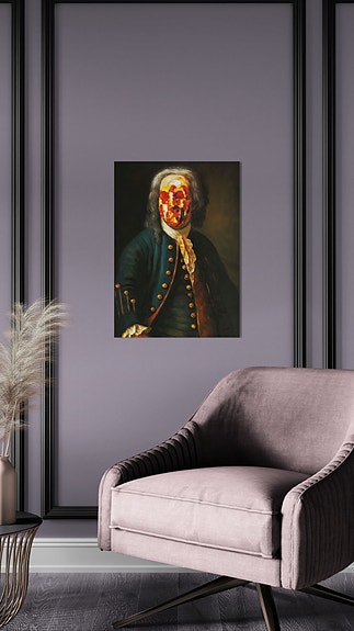En person i sort dragt med høj krave, næsten gejstlig i sin tilstedeværelse, men ansigtet eksploderer i blå, gule og røde farver. Det er som om sorgen er malet ind i selve huden, et udtryk for menneskelig sårbarhed bag tidens klæder.