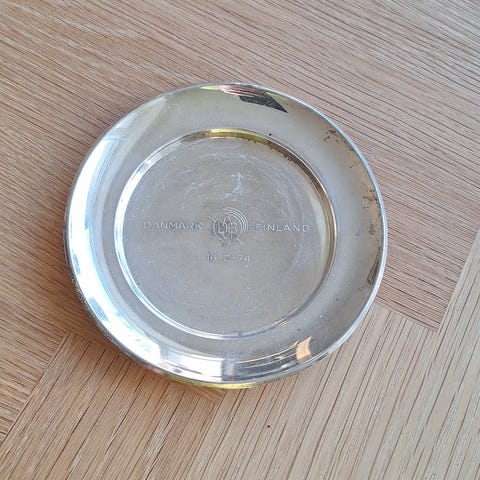 Elegant lille bronzefad med indgraveringen “1987” og et diskret emblem i midten.