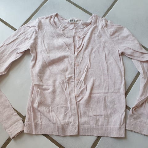 Cardigan i lyserød og hvid bluse. Brugt men i god stand. Str. 158-164.