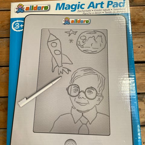 Tavle til kridt, formet som en robot med sort skriveflade og grønne detaljer. Købt for mange år siden men aldrig taget i brug. Ca. 40 x 60 cm.