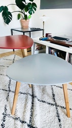 Selling a set of 2 stylish side tables in complementary colors – one matte grey, the other matte red. Both have wooden legs and soft, organic shapes that go great together.