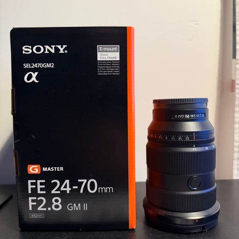 Sony FE 24-70mm f/2.8 GM objektiv med zoomfunktion. Objektivet har en brændvidde på 24-70 mm og en maksimal blænde på f/2.8. Designet til full-frame kameraer, lavet af materialer af høj kvalitet med sort finish. Velegnet til fotografering/video i forskellige situationer, herunder portrætter, landskaber og begivenheder.