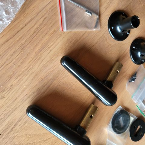 En kasse med Bakelit håndTag og tilbehør. Flotte retro håndtag i den gode gamle kvalitet. Bliver produceret igen men sælger her de ægte og til en helt anden pris.