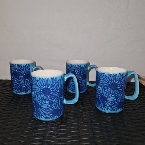 4 krus / store kopper med undertallerkner. Fin smothe glød og blomster / Bladranker. Virkelig cool retro stil. Tror 70s / 80s. Måler 7,5 cm i hj. Dia 8,5 cm.