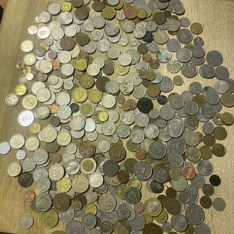 Samling af diverse mønter med forskellige størrelser, farver og materialer. Indeholder mønter med varierende design og oprindelse. Velegnet til samlere eller som reference til mønthistorie.