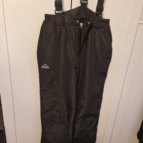 McKinley skibukser i blå farve, størrelse 176. Bukserne har justerbare seler, lynlåse ved benenden og forstærkninger ved nederste del af benene. Materialet er velegnet til skiløb og udendørs aktiviteter i koldt vejr, med fokus på funktionalitet og komfort.
