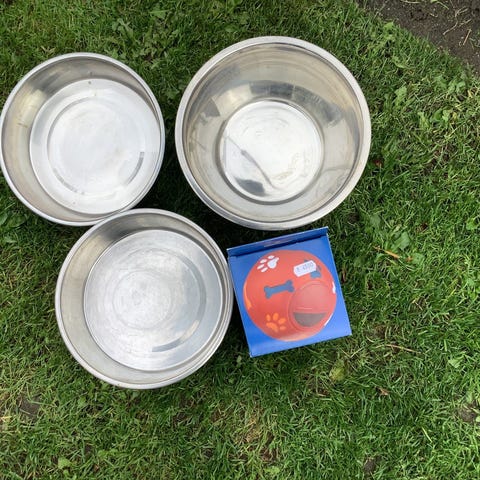 Helt nye skåle med stativ sælges . Det er et fejlkøb ( de er for store til den hund De var tiltænkt ) Der er 0.6 liter i hver skål . Stativ er metal / skåle i porcelæn . Sættet sælges for 125kr