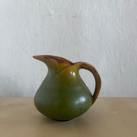 Kanden er dekoreret med vinblade og druer, og håndtaget er formet som en naturlig gren.